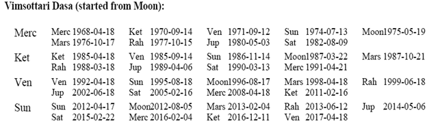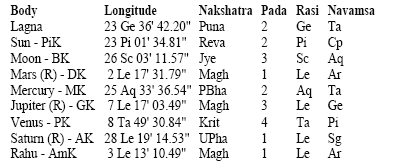 BJP was formed on Sunday 6th April, 1980 at 11:45 AM in New Delhi. The corresponding planetary positions, Vedic horoscope and Vimshottari mahadasha details are listed here. BJP lagna is Gemini and Moon rasi is Scorpio. Note the connection of lagna lord with ninth and moon as ninth lord in scorpio, both signifying strong religious connection. The Vimsottari Mahadasha shows currently running Mercury Bhukti in Venus mahadasha. Note transit saturn will occupy a very favorable position in Virgo from scorpio moon from Sept. 2009. The horoscope is considerably strong when judged from Moon with many yogas present for power more so during subsequent Sun Mahadasha.