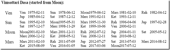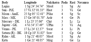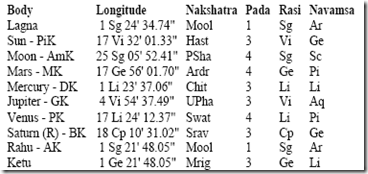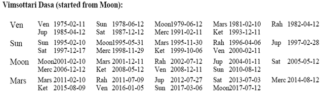 It was founded on October 4, 1992 as former Janata Dal, India’s primary opposition party prior to the BJP, broke up into several regional parties. In the absence of exact time, we consider the midday horoscope. The corresponding planetary positions and Vimshottari mahadasha details are listed here. Moon is in Sagittarius with Jupiter moon rashi lord in 10th from it, Venus in Libra, Saturn in own house in Capricorn. Mars is in enemy house in Gemini. Saturn’s entry in Virgo in Sept. 2009 will bring better fortune for Samajvadi Party.