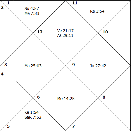 Trig’s Vedic horoscope is shown here. His ascendant (lagna) is Pisces with Venus exalted in it. Moon the fifth lord is in the seventh house in Hasta nakshatra. Saturn with Ketu in sixth house and twelfth from Moon